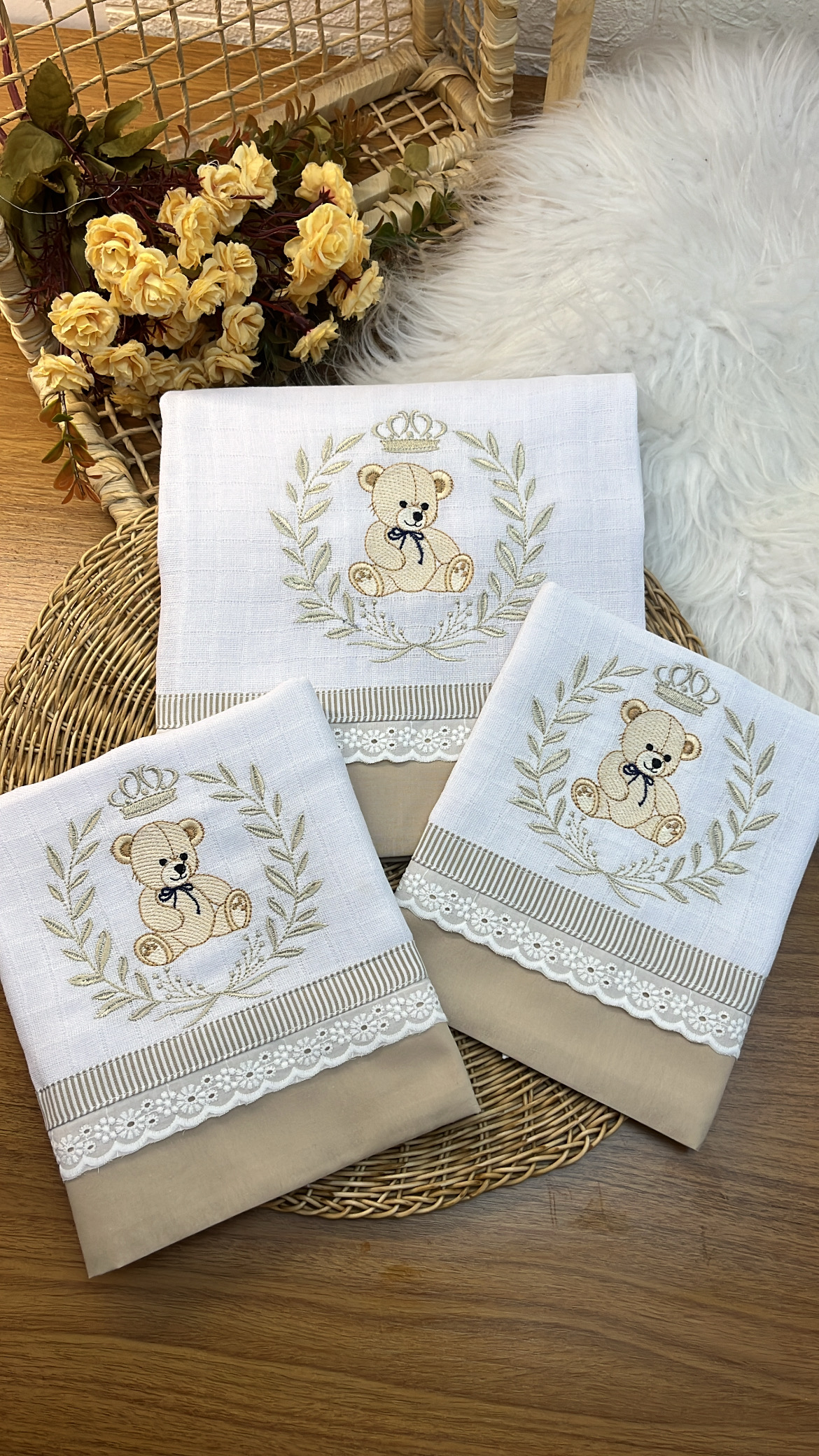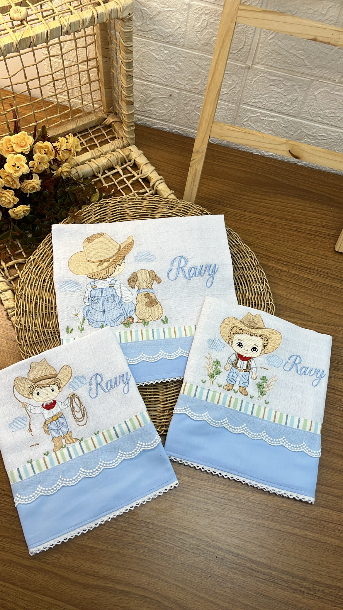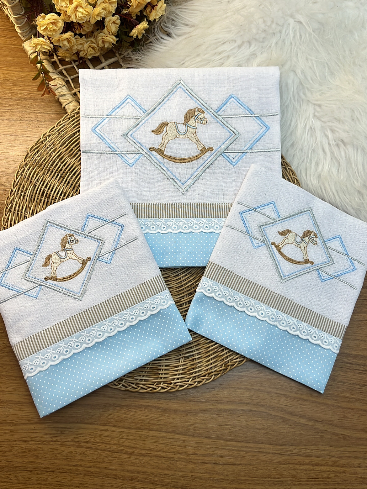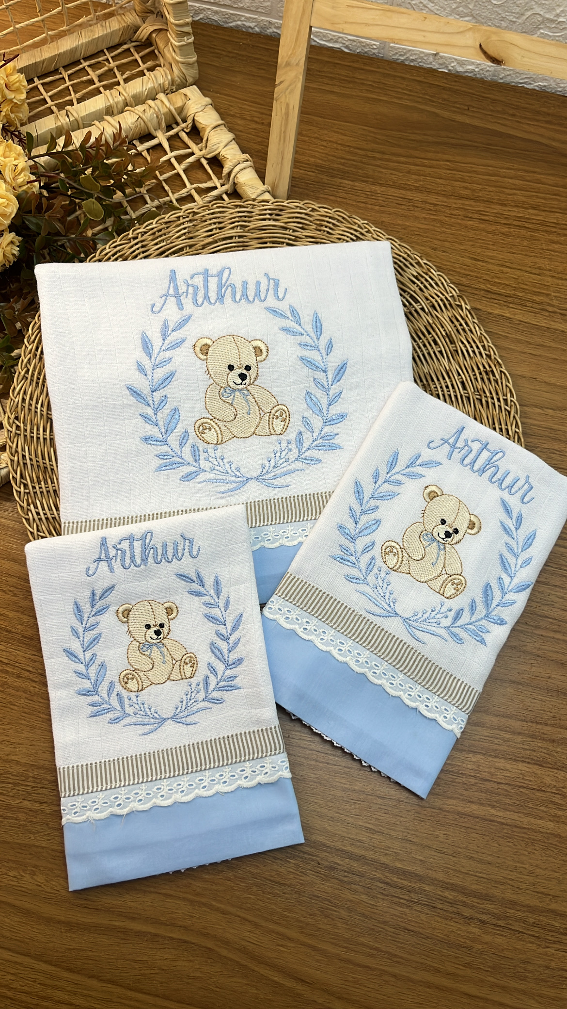 Feita em tecido de alta absorção e maciez, ela vem personalizada com o nome do bebê e lindos bordados exclusivos, que tornam cada peça única. Com acabamento refinado em tecido estampado e barrado decorativo, é ideal para levar em passeios, consultas ou usar em casa com muito estilo.