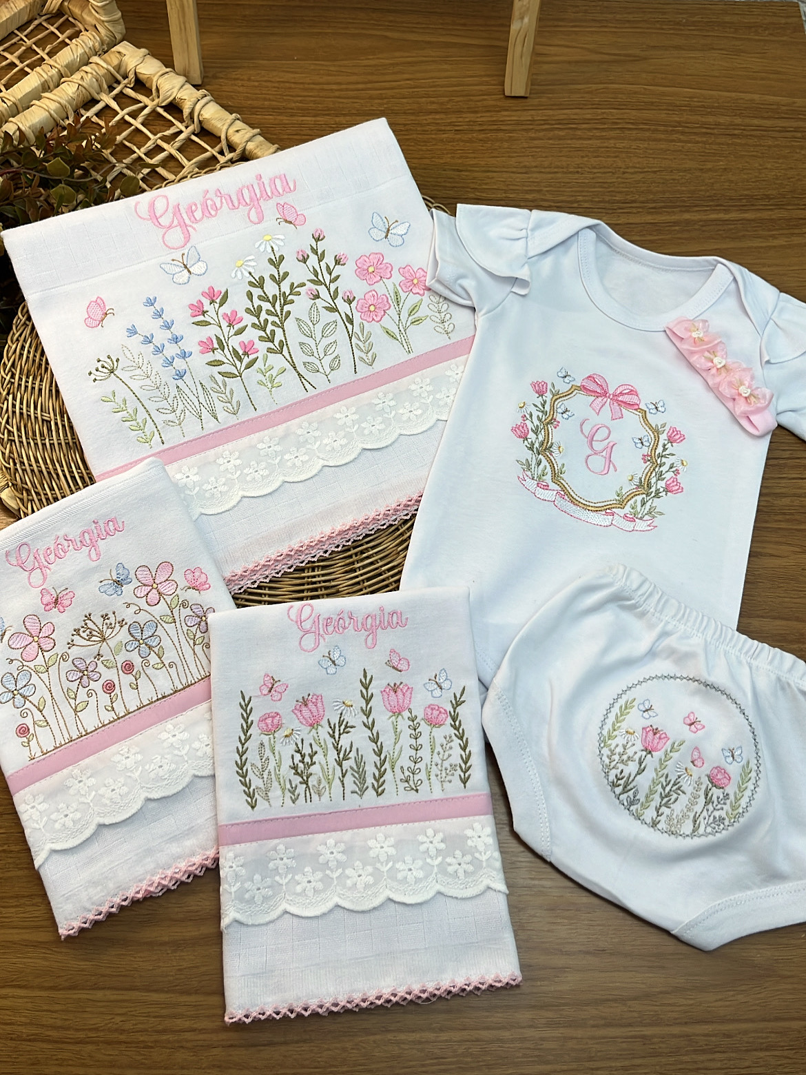 Cada peça pode ser personalizada com o nome do bebê, tornando o kit ainda mais especial e exclusivo. Ideal para acompanhar os momentos de cuidado e carinho, seja em casa, em passeios ou na maternidade.